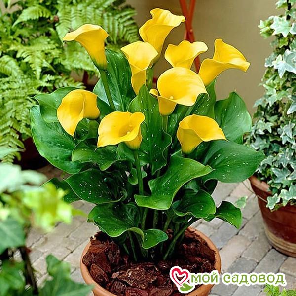 Калла Саншайн — формирует восковидный желтый бокал диаметром 7−8 см. Высота «покрывала» достигает 15 см. Рост в период цветения может составлять до 60 см.Растение формирует сразу несколько цветоносов. Охваченные крупными прикорневыми листьями стебли образуют подобие флористической композиции. Сорт отлично смотрится в срезке. Цветение май-август (в зависимости от срока высадки клубней). Количество цветков зависит от размера клубня, может быть от 3 до 10. ПОСАДКА М УХОД. Рано весной в горшки для комнатной культуры, в открытый грунт — после того, как минует угроза заморозков. Клубни сажают на глубину 5-10 см и хорошо проливают почву, поскольку каллы любят влагу. Для посадки каллы подойдет притененный участок. Идеальный вариант, место под негустыми кронами деревьев. Чтобы было достаточно светло, а солнечные лучи не обжигали листьев. Очень эффектно смотрятся каллы, рядом с искусственным водоемом. Отлично цветет и растет только в тепле, где температура не ниже 18°C, самая оптимальная температура 22-23°C. Не переносит сквозняков. Цветоносы этого растения высокие, которые идут прямо от низа растения. На открытом воздухе это прекрасное растение цветет 1 месяц, а в закрытом помещении — 14 дней. Осенью растения сбрасывают листья. На зиму клубни каллы нужно выкопать и хранить в непромерзаемом помещении.