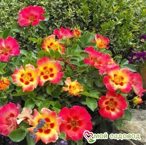 Цветки простые (4-8 лепестков), диаметром 5-10 см, жёлтые с красной каймой различных оттенков и тёмно-красным пятном в основании лепестков. Цветение обильное, повторное, до заморозков. Листва глянцевая, тёмно-зелёная, устойчивая к заболеваниям. Куст компактный, высотой 40-50 см. Рекомендуется как бордюрная, контейнерная или балконная роза. Хранение до посадки Как хранить растения, если вы получили посылку раньше начала посадочного сезона? Для хранения саженцев роз есть несколько простых правил: Если роза спит — храним в холодильнике или подвале при температуре от 0 до +4 °С, или на улице в коробке под толстым слоем снега. Если роза проснулась — прикопать в теплице или высадить в сад, обеспечив укрытие. Можно посадить розу в горшок и хранить в прохладном подвале или на балконе/лоджии, притеняя от прямых солнечных лучей. Во время хранения периодически проверяйте состояние посадочного материала. Поврежденные, загнившие части корней удалите и обработайте фунгицидом (Топаз, Фитоспорин).